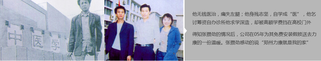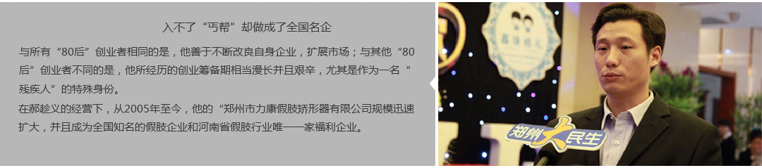 鄭州市力康假肢矯形器有限公司(簡(jiǎn)稱力康),是一家專(zhuān)業(yè)從事假肢矯形器的設(shè)計(jì)、研發(fā)、制作及裝 配的專(zhuān)業(yè)機(jī)構(gòu)。成立于1992年是河南省唯一一家福利企業(yè)。力康下設(shè)業(yè)務(wù)部、技術(shù)部、住院部、康復(fù) 部、售后服務(wù)部,并配有現(xiàn)代化的裝配車(chē)間和功能齊全的訓(xùn)練大廳,為殘疾朋友康復(fù)訓(xùn)練提供了可靠 保障??偨?jīng)理穿戴假肢多年,有著豐富的臨床經(jīng)驗(yàn)和親身體會(huì);多年來(lái),力康已為全國(guó)幾十萬(wàn)名殘疾 朋友安裝上舒適、美觀、耐用的假肢和矯形器具,使他們更大限度地恢復(fù)了正常的工作和生活?!爱a(chǎn) 品即人品”的質(zhì)量理念、先進(jìn)的技術(shù)、實(shí)惠的價(jià)格、完善的售后服務(wù)是力康取勝的法寶……